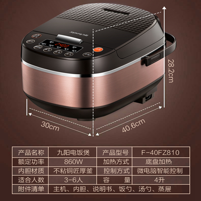 九阳(Joyoung)电饭煲 电饭锅 智能预约 多功能大功率 4L大容量 不粘内胆 40FZ810【金釜内胆/黑色】 |