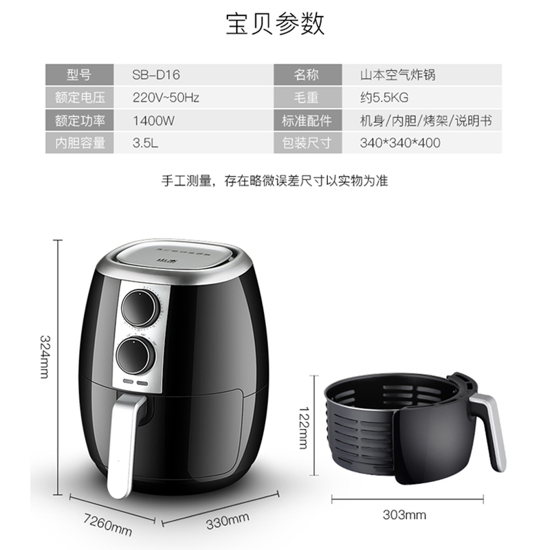 山本空气炸锅家用3.5升多功能电炸锅SB-D16【PP/黑色】 |