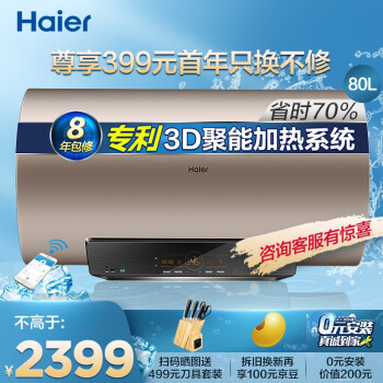 海尔(Haier)80升电热水器 3D速热 8倍增容 WIFI遥控 一级能效节能抑菌专利2.0防电墙EC8005-ST5 |