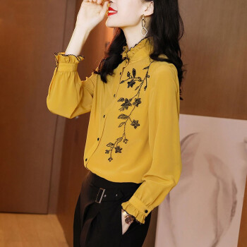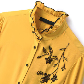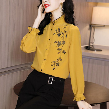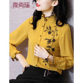 微尚瑶衬衫女2020秋季新款复古优雅荷叶边钉珠长袖立领女上衣气质优雅百搭黄色系扣女上衣6985 黄色 请拍正确尺码 |