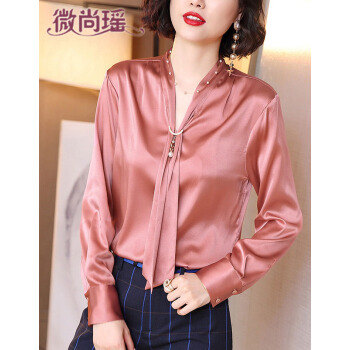 微尚瑶衬衫女2020秋季新款韩版气质减龄立领系带纽扣上衣女百搭休闲纯色V领衬衣女6976 粉色 请拍正确尺码 |
