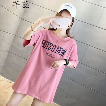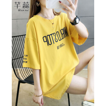 芊蕊短袖t恤女2020夏季新款韩版宽松大码女装中长款刺绣字母圆领短袖体恤上衣潮 黑色 L |