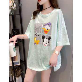 芊蕊t恤女短袖2020夏季新款韩版宽松印花字母中长款大码女装胖MM半袖打底上衣服 2389杏色 M |