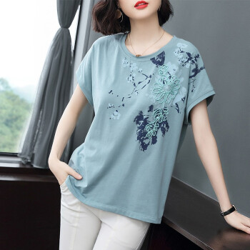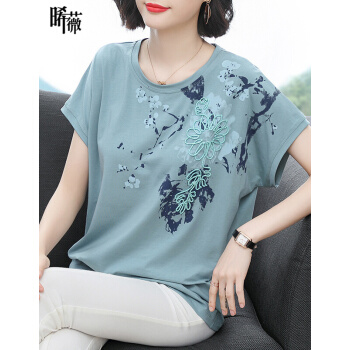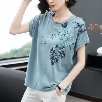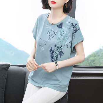 【精选好货】晞薇2020夏装新款年棉女装立体花朵拼接图案碎花短袖T恤女上衣大码中年妈妈半袖t桖夏 豆绿 M |