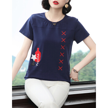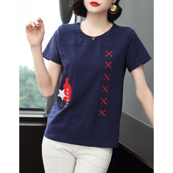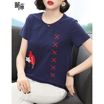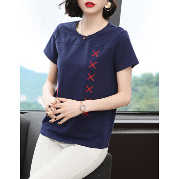 【精选好货】晞薇妈妈夏装小衫T恤短袖女2020新款中年妇女大码女装显瘦遮肚体桖棉宽松休闲上衣女 深蓝色 请拍正确尺码 |
