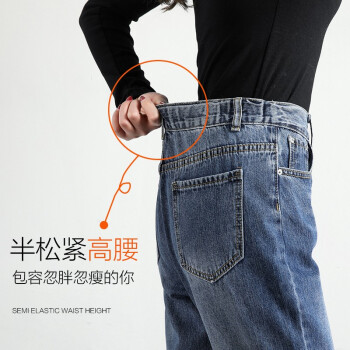麦潮尚2020秋季新款松紧腰牛仔裤女高腰橡筋老爹裤显瘦哈伦裤子 复古蓝色 XXS建议70斤内 |
