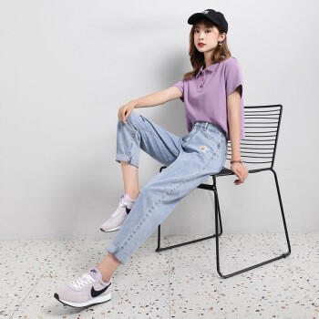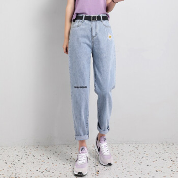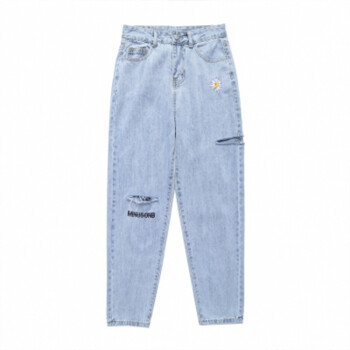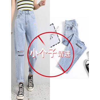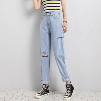 阅樱破洞牛仔裤女夏薄2020新款女裤高腰直筒九分裤女宽松大码胖妹妹显瘦老爹裤萝卜裤垮裤学生小雏菊裤子 破洞款 L |