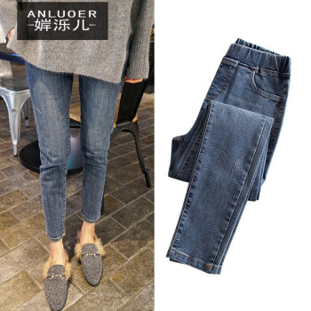 婩泺儿牛仔裤女2020初秋季新款大码女装胖mm弹力牛仔裤九分裤女新款显瘦修身小脚裤女 (高品质蓝色)现货 XL(100-120斤) |