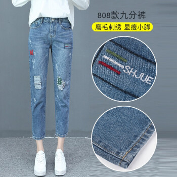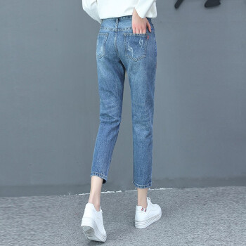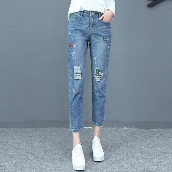 卓芭莎九分牛仔裤女2020夏季新款薄款宽松休闲直筒裤子女破洞小脚女裤潮 蓝色-九分裤 M |