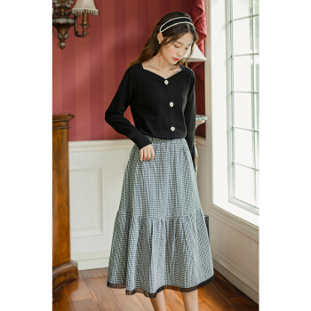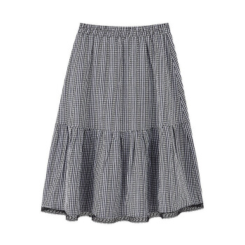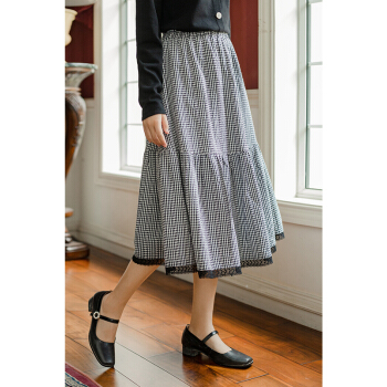 茵曼2020秋装新款松紧高腰A字中长款学院花边文艺复古格子半身裙【F1803571】 黑格 L |