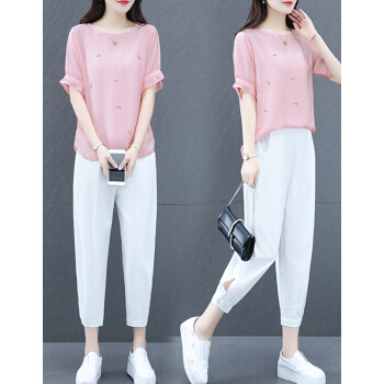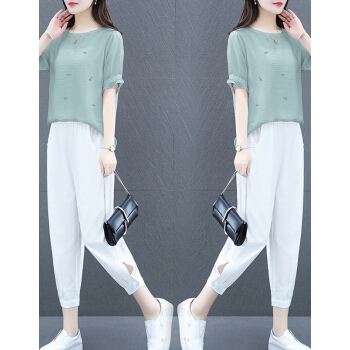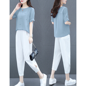 婪澈休闲裤女2020年新款女装夏季大码女装洋气微胖妹妹显瘦时髦棉麻套装两件套套装女 蓝色 请下正确尺码 |