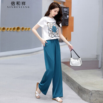 信和祥休闲裤女雪纺套装女夏装2020新款气质女神范衣服洋气减龄休闲两件套阔腿裤 蓝色 L |