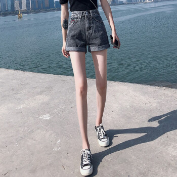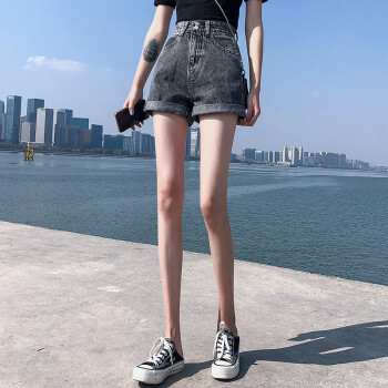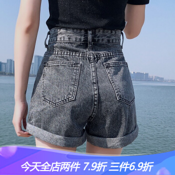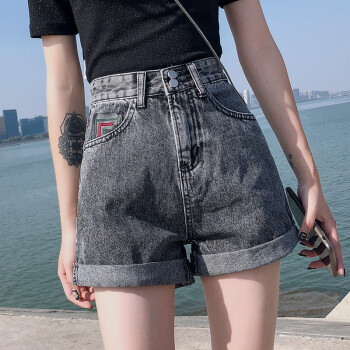 沫澜仟衣高腰牛仔短裤女2020夏季新款韩版宽松显瘦阔腿裤子女休闲百搭外穿a字热裤优质面料 黑灰 XL |