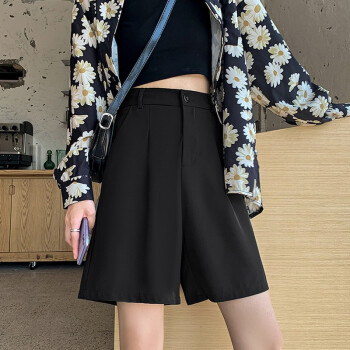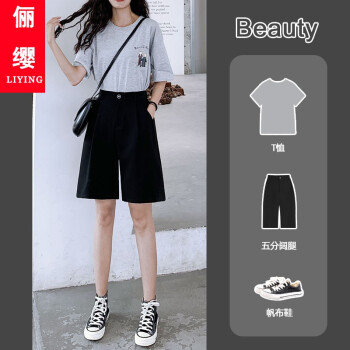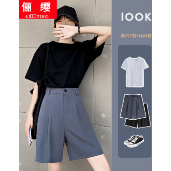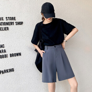 俪缨短裤女西装裤短款阔腿女2020年夏季新款韩版中裤帅气高腰垂感港味冰丝薄款百搭潮流黑色五分裤子 灰色 L【106-120斤】 |