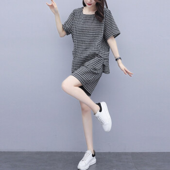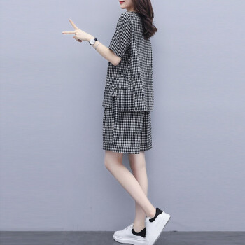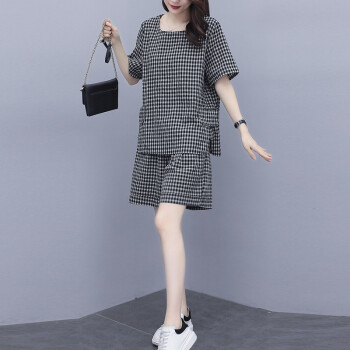 伊轩坊短裤女夏2020新款大码女装韩版宽松显瘦洋气减龄格子休闲时尚套装女两件套 格子套装 L |
