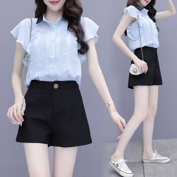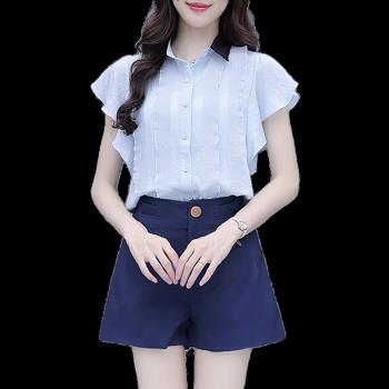 思语林 雪纺衫短裤套装女2020夏装新款小个子显高洋气减龄休闲短裤子两件套 粉色套装 S |