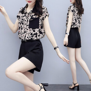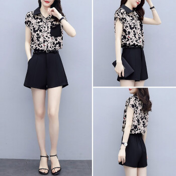 缪资 2020夏季新款韩版时尚雪纺套装女休闲气质短裤小个子洋气两件套潮 黑色套装 M |