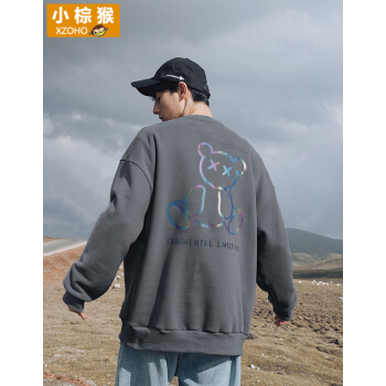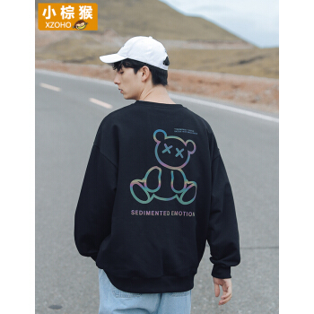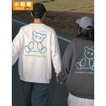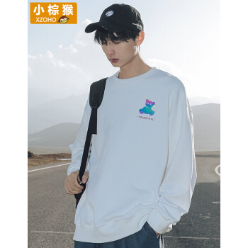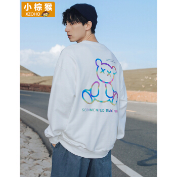 小棕猴 长袖圆领卫衣男秋季宽松白色炫彩反光潮牌小熊2020新款长袖T恤男宽松潮ins港风情侣卫衣男 G3045本白色 L |