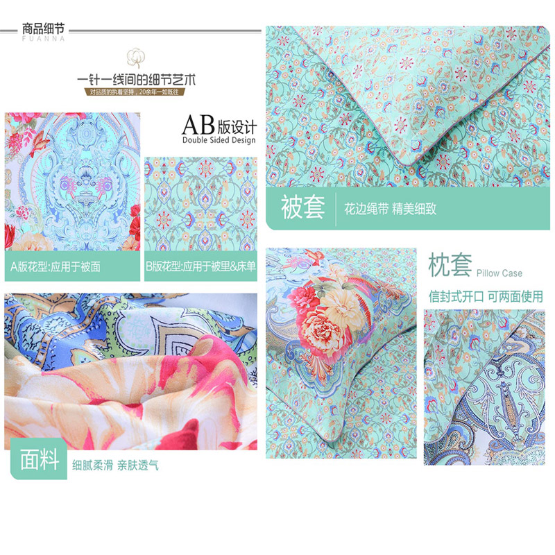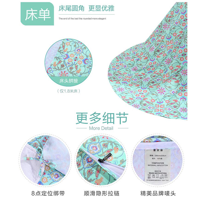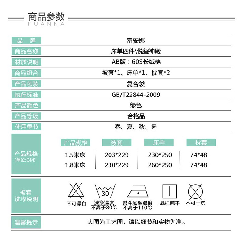 悦玺神殿 床单四件(被套1件床单1件枕套2件)(适合1.8米床)【60支长绒棉/绿】 |