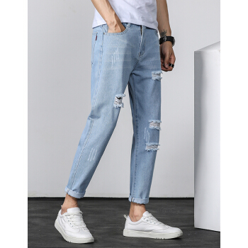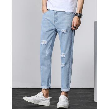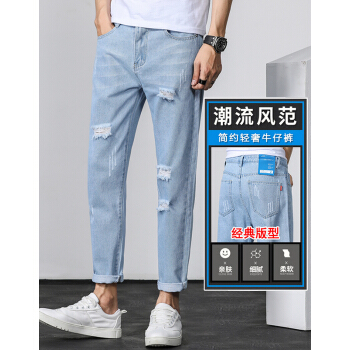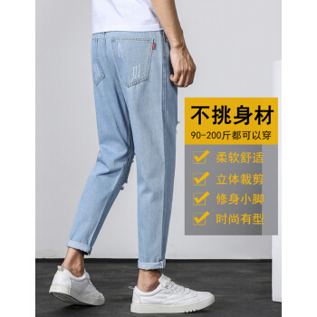 等歌 牛仔裤男士休闲裤男裤潮牌裤子男新款夏季韩版修身直筒束脚中高腰弹力复古磨透气小脚九分长裤子男 803蓝色 XL |