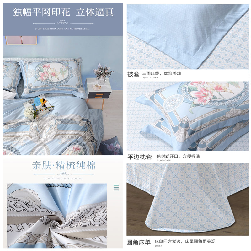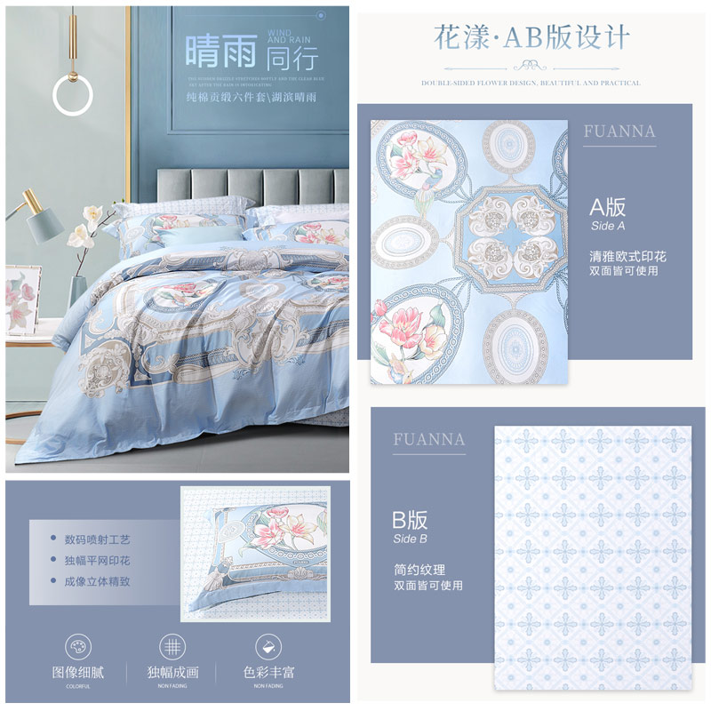 湖滨晴雨 床单六件套(被套1件床单1件枕套4件)(适合1.8米床)【纯棉缎纹/蓝】 |