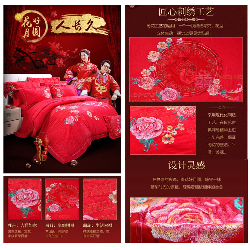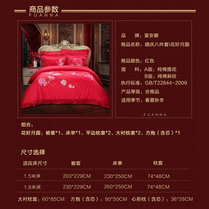 花好月圆 床单八件套(被套1件床单1件枕套4件方抱芯1件方抱套1件)(适合1.5米床)【纯棉提花/红】 |