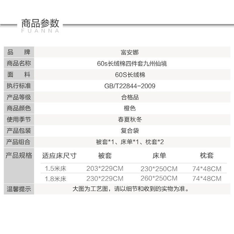 九州仙境床单四件套(被套1件床单1件枕套2件)(适合1.5米床)【60支长绒棉/橙】 |