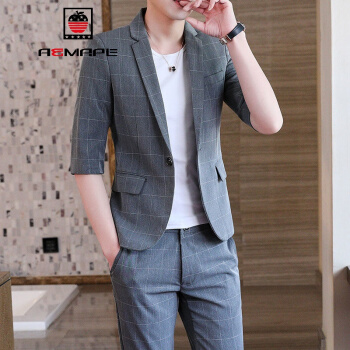 AEMAPE/美国苹果夏季西服套装男修身中袖小西装一套时尚休闲七分袖外套气质男装潮 926灰色套装(送T恤) XL 120-135斤 |
