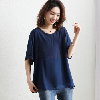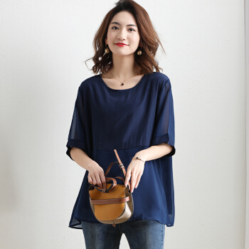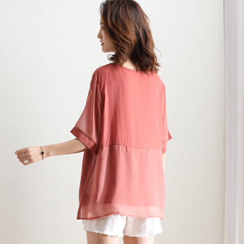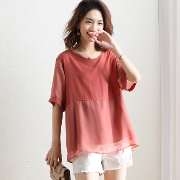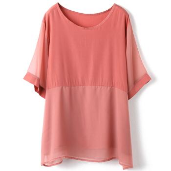 红粉宣言2020夏季新款宽松套头拼接雪纺衫女短袖大码女装 粉色 L |