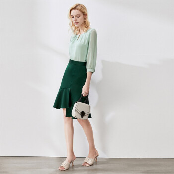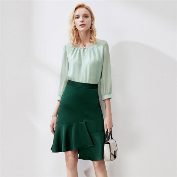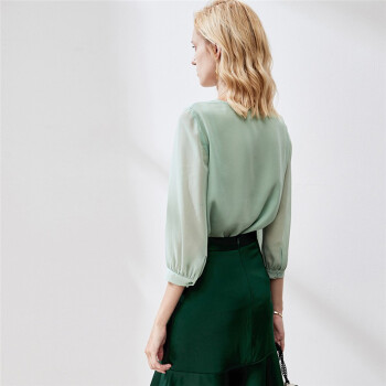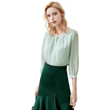 颜域薄荷绿圆领雪纺衫女2020新款秋装减龄宽松显瘦七分袖气质上衣 浅绿 M |