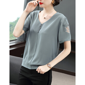 【精选好货】Hizze短袖雪纺衫女2020新款夏装时尚洋气雪纺上衣大码中年妈妈装碎花遮肚小衫T恤夏 浅灰蓝 请拍正确尺码 |
