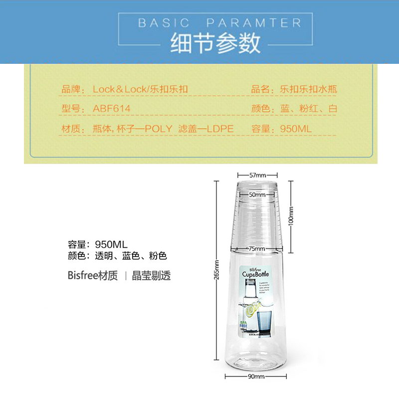950ml大容量凉水壶,杯盖可直接当水杯使用,方便快捷,杯口有内盖设计防止大面积洒水【塑料杯/颜色自选】 |
