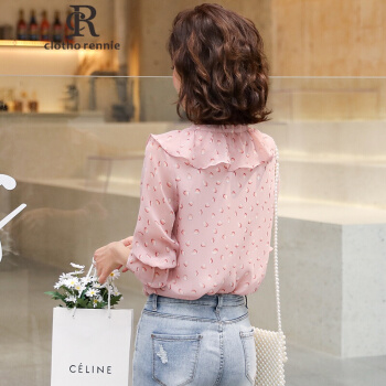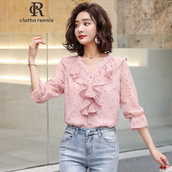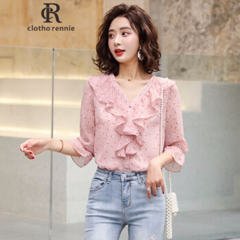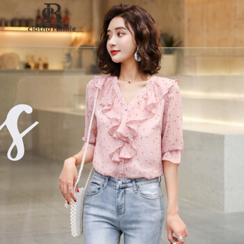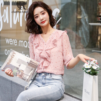 c1otho Rennie碎花雪纺衫短袖女2020夏季新款韩版宽松荷叶边V领上衣百搭仙气显瘦显气质 粉色 S |