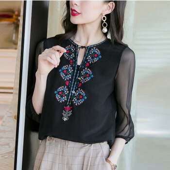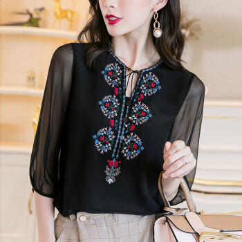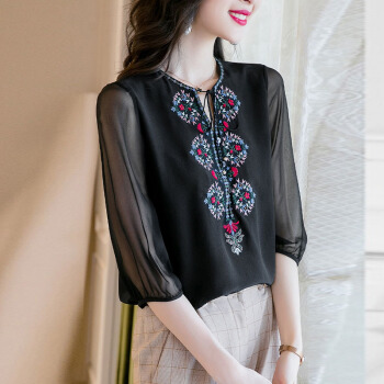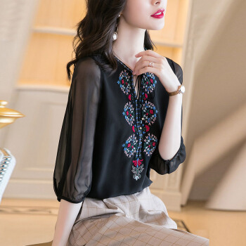 依语幽香复古绣花雪纺衫女2020夏季新款时尚v领透视短袖上衣 黑色 L |