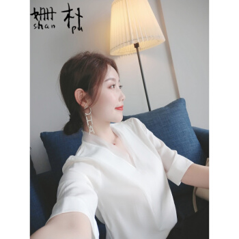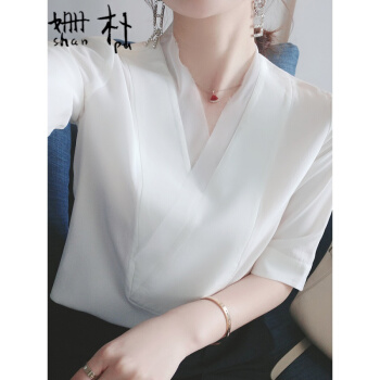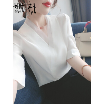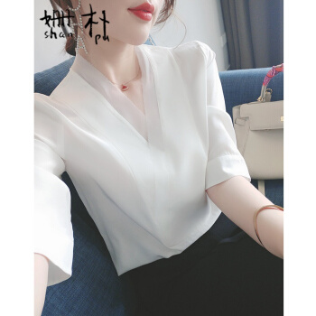 姗朴 雪纺衫女2020韩版夏季新款大码女装雪纺洋气上衣宽松显瘦气质小衫短袖休闲时尚仙气V领港味衬衫 白色 L |
