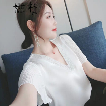 姗朴 雪纺衫女2020夏季新款大码女装印花雪纺洋气上衣宽松显瘦小衫短袖休闲时尚仙气V领港味荷叶袖衬衫 白色 L |