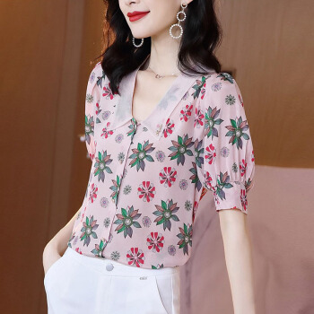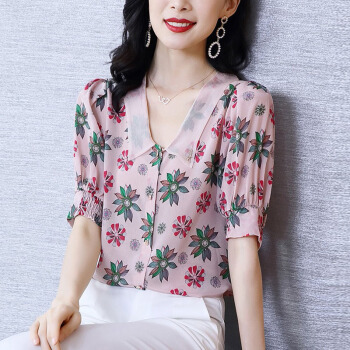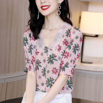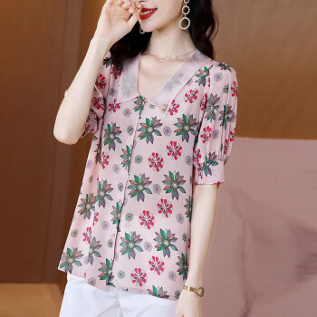 碎花雪纺衫女短袖夏季2020新款娃娃领衬衫洋气小衫法式泡泡袖时尚减龄气质衬衣潮 粉红色 L |