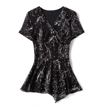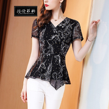 拉伦菲韵 意式高端品牌女装 短袖碎花雪纺衫2020夏装法式复古洋气百搭修身显瘦收腰V领上衣潮 黑色 L |