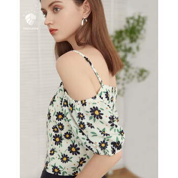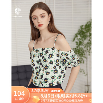 范思蓝恩 2020夏新款碎花雪纺衫短款一字肩上衣女短袖露肩吊带小衫 白底印花 XS |