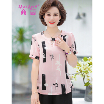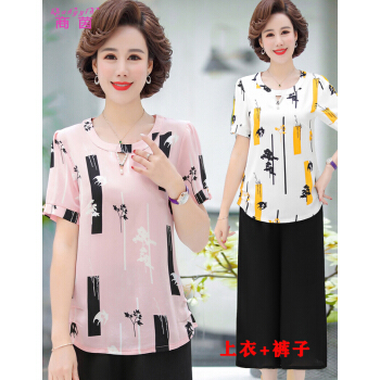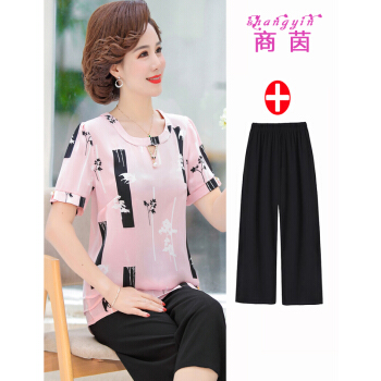 商茵SY中老年女装妈妈装2020年新款夏装短袖衬衫减龄洋气雪纺衫中年人t恤中老年女装上衣+裤子套装 粉红色+阔腿裤 2XL【建议105-120斤】 |