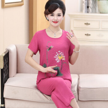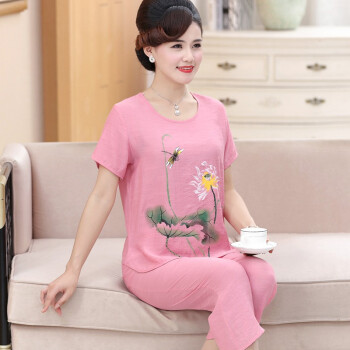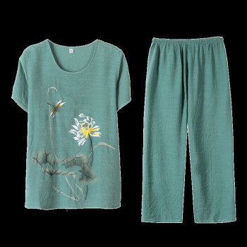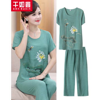 干如鑫中老年女装妈妈装时尚休闲套装女棉麻两件套宽松大码女装4050岁洋气宽松衣T恤休闲运动套装跑步服 豆绿色 2XL(105-125斤) |