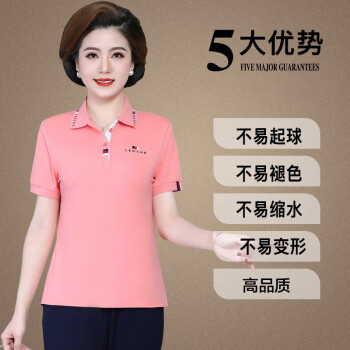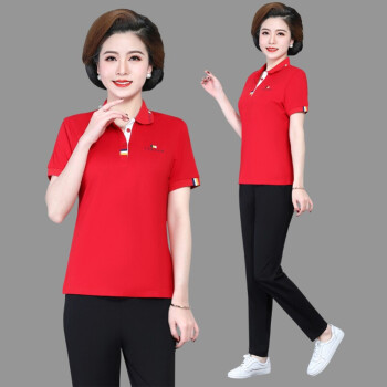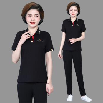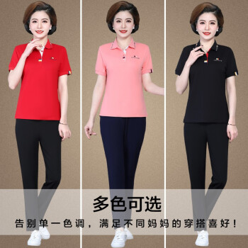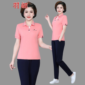 羽翩中年女装夏装40岁50岁中老年人短袖t恤上衣长裤气质妈妈装夏天妇女洋气薄运动服两件套装 粉色 XL |