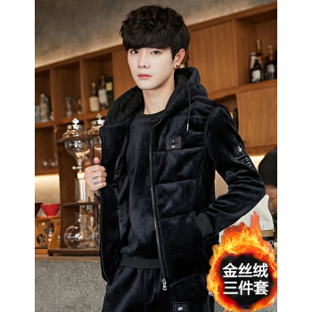 潮人卫衣男潮流衣服冬装情侣卫衣冬季金丝绒加绒加厚卫衣套装男韩版男生三件套男装 黑色 XL |