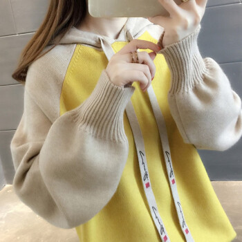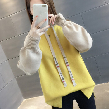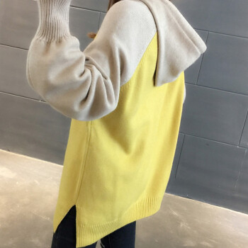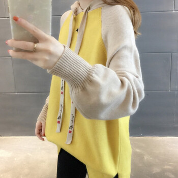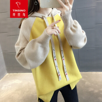 纤丝鸟 TINSINO 针织衫女2020秋冬新品拼色连帽针织毛衣女韩版宽松休闲上衣外套 黄色 请拍正确尺码 |