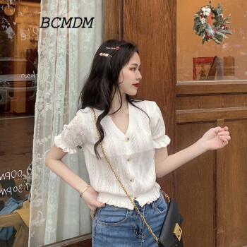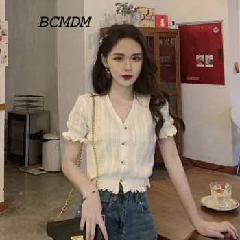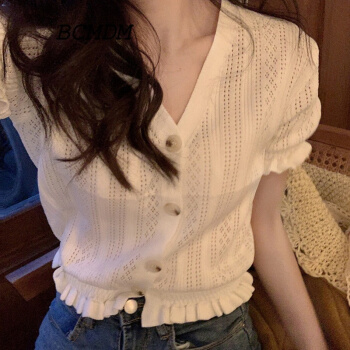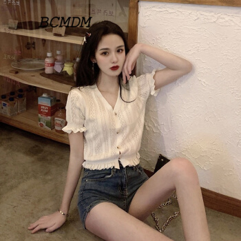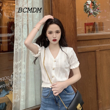 BCMDM 香港潮牌露脐短款针织衫女 2020夏季新款气质复古V领镂空收腰木耳边针织衫纯色短袖上衣 白色 M |