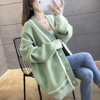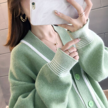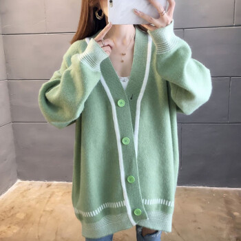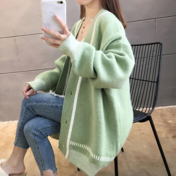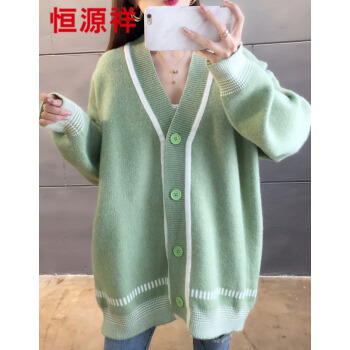恒源祥针织衫女2020秋季新品韩版中长款开衫外套女针织衫潮宽松慵懒风时尚百搭V领上衣女111 绿色 M |