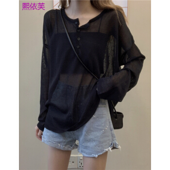 熙依芙针织衫女宽松外穿黑色防晒上衣女2020春夏韩版新款薄款套头洋气针织打底衫 黑色 均码 |