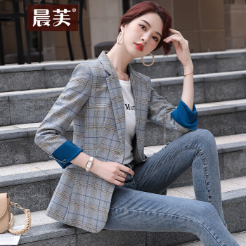 晨芙长袖格子小西装女外套时尚英伦风休闲复古学生百搭修身显瘦通勤上衣chic气质拼色小香风西服工作服 单件灰格西装 XL |