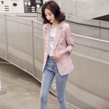 简草 小西装女2020秋季新款时尚韩版气质百搭修身休闲格子一粒扣单层小西服短外套女X8012 粉色 2XL |