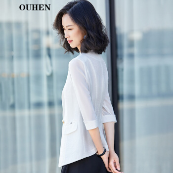 OUHEN轻奢品牌女装小西装外套女2020夏季新款薄款白色七分袖韩版休闲网纱拼接西服女上衣 白色中袖西装 L(建议96-105斤) |